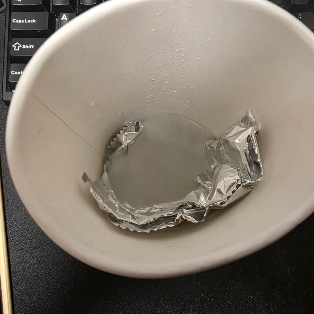 紙コップに熱湯を注ぎ、大さじ一杯の重曹を入れてアルミホイルを浸す。